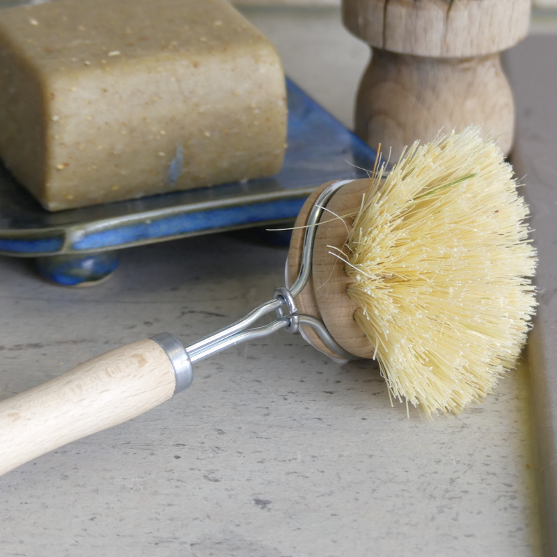 La brosse vaisselle en bois de hêtre et en fibres naturelles d'agaves, pratique et écologique, accompagne parfaitement notre savon ménager pour nettoyer et désencrasser facilement votre vaisselle.